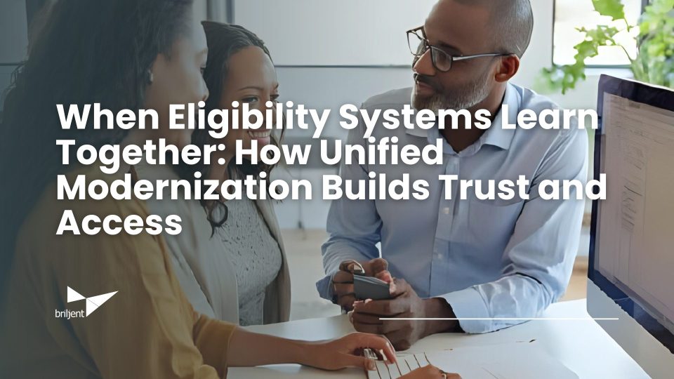 Three professionals collaborating at a desk with a computer, representing teamwork and unified modernization in eligibility systems. Text overlay reads: ‘When Eligibility Systems Learn Together: How Unified Modernization Builds Trust and Access.’ Briljent logo in corner.”